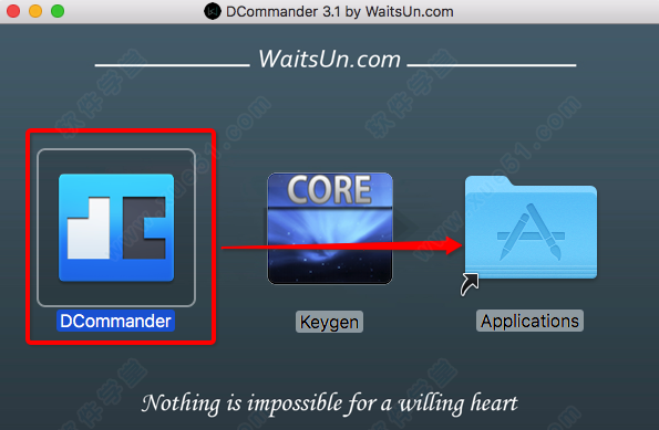 1、打开dmg镜像文件,将“dcommander”拖入应用程序中进行安装;