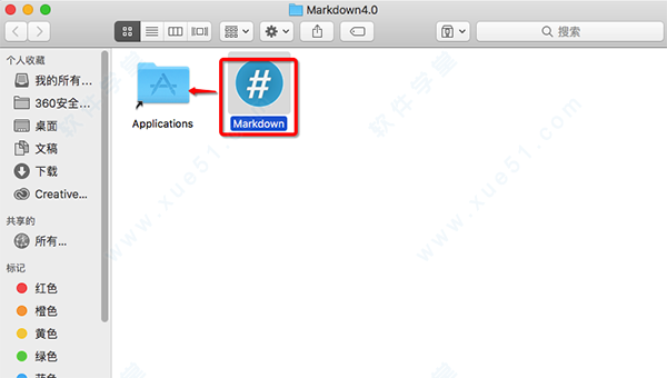 1、打开软件包,将“markdown”拖入应用程序中进行安装;