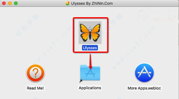 1、打开dmg镜像文件,将“ulysses”拖入应用程序中进行安装;