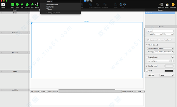 2、paintcode默认帮我们生成了一个canvas,就类似于画图软件里面的画布,然后查看我们的右侧,有一个面板。