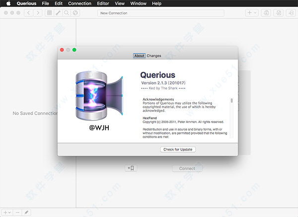 2、等待软件安装完成后软件自动运行,点击桌面左上角的软件图标,在弹出的下拉窗口中选择“About Querious”查看软件相关版本信息,出现下图表示软件成功注册激活使用;