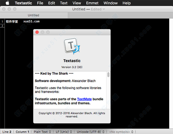 2、等待软件安装完成后自动运行,点击桌面左上角的软件图标,在弹出的下拉框中选择“About Textastic”查看软件版本信息,出现下图表示软件成功注册激活使用;