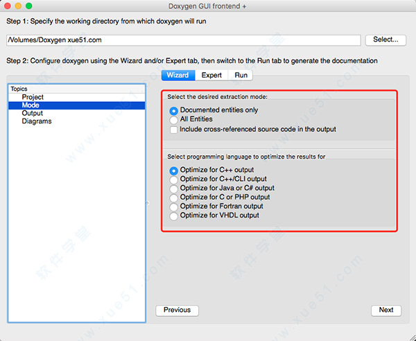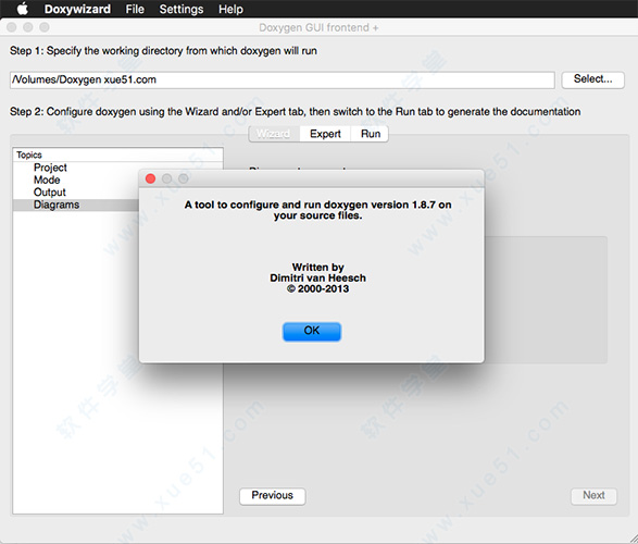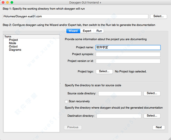 1、运行软件,进行“Doxygen”文档输出的相关设置向导,首先设置doxygen的工作路径,然后提供你需要创建的项目文档信息,点击“Next”完成设置;