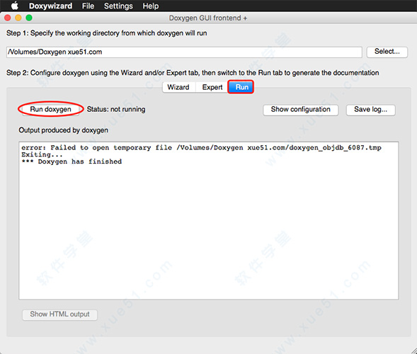 4、设置完成后点击“Run”功能栏,点击“Run doxygen”输出文档;