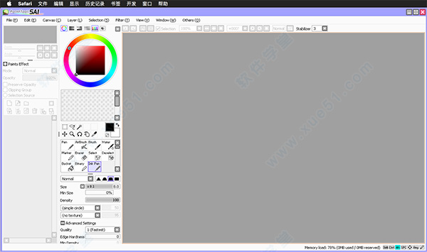 painttool sai mac是一款针对mac平台为用户提供轻松化绘图的手绘制作工具,它不仅能够与数码绘图板进行极好的相互兼容操作,还能在保证绘图美感的同时,进行简便的插画制作效果,软件占用内存小,没有庞大的系统资源容量却能实现人性化的功能,给众多的数字插画家以及CG爱好者营造了一个强大的插画制作环境,极大的提升了用户在插画制作过程中的绘画体验。