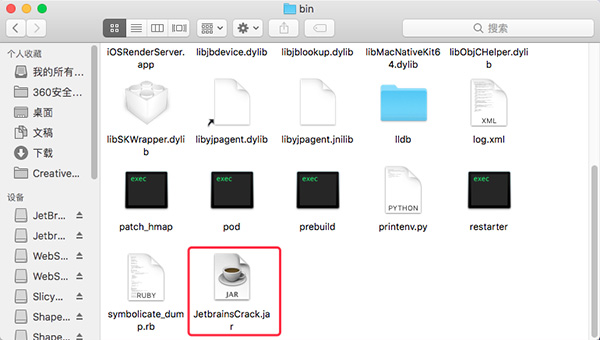 2、等待软件安装完成后先不要运行软件,回到之前打开的dmg镜像界面,打开“Crack”文件夹,将文件夹目录下的“JetbrainsCrack.jar”复制到软件的安装目录下,默认目录为【Application/AppCode.app/Contents/bin】,如图所示: