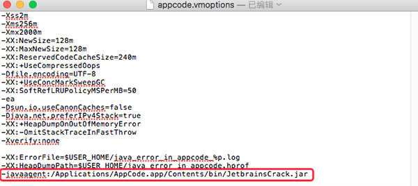 -javaagent:/Applications/AppCode.app/Contents/bin/JetbrainsCrack.jar然后将文件保存即可;