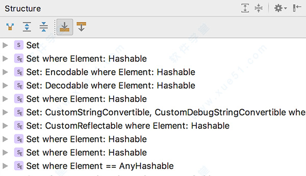 6、适应协议和where子句。在结构视图、文件结构对话框中看到采用的协议和where子句,然后进入Class/Symbol popups。