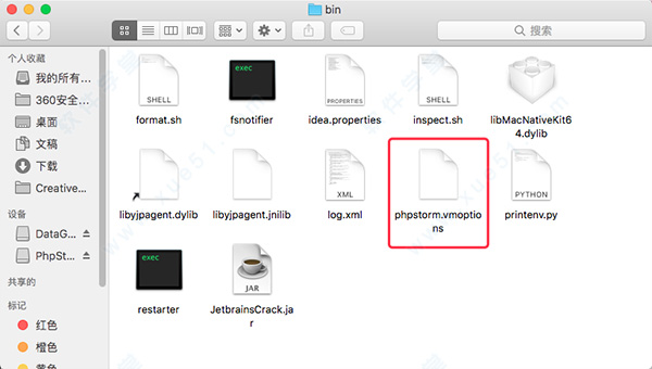 3、在当前目录下,也就是【Application/PhpStorm/Contents/bin】目录下找到【phpstorm.vmoptions】文件,右键选择合适的文本编辑器打开编辑;