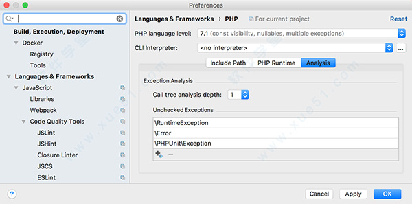 3、可配置未经检查的异常PhpStorm引入了一个新的异常分析引擎,它可以捕获未处理的异常,检测丢失的@抛出标记,等等。为了添加有时需要的可配置性,在PhpStorm 2018.1中,我们添加了被排除在分析之外的异常列表。