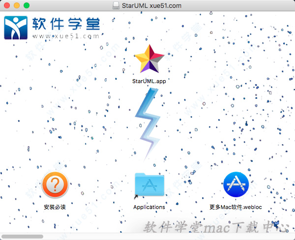 1、在本站下载好mac文件包,打开dmg镜像文件,将“StarUML”拖入到“Applications”应用文件夹中进行安装或者双击“StarUML”执行镜像设备运行过程;