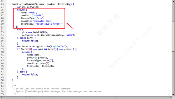 2、等待软件安装完成后先不要运行软件,打开对应目录/Applications/StarUML.app/Contents/www/license/node/LicenseManagerDomain.js文件,找到validate()函数,修改对应下面函数,添加如下代码: