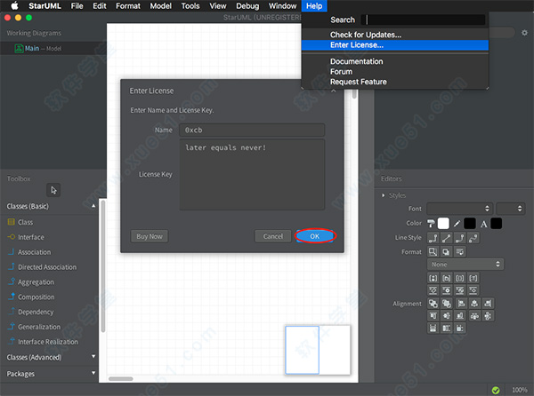 3、运行程序,在macos菜单栏中点击“Help”按钮,弹出的下拉框中选择“enter license”输入: