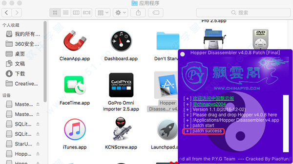 2、等待软件安装完成后先不要运行软件,在应用程序中找到安装完成的hopper disassembler,直接将软件拖入【hopperV4Patcher.app】的界面里,如图所示: