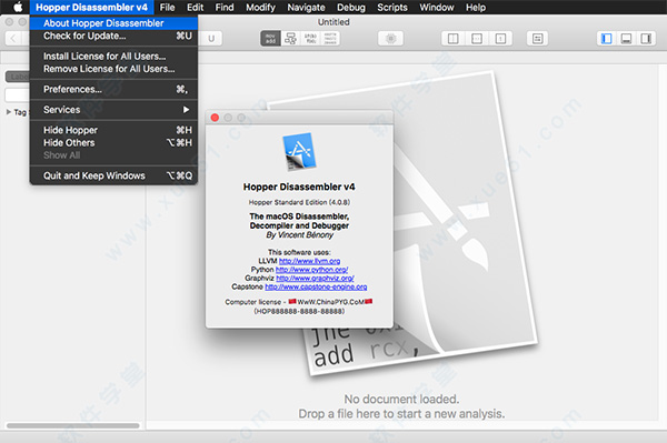 3、运行软件,点击macos菜单栏中的软件图标,在弹出的下拉框中选择“About Hopper Disassembler v4”查看软件相关版本信息,出现下图代表软件成功注册激活使用;