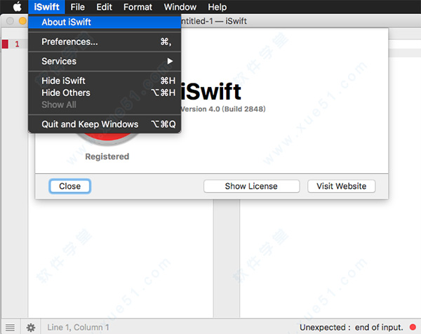2、等待软件安装完成后运行软件,点击macos菜单栏中的软件图标,在弹出的下拉框中选择“About iSwift”按钮查看软件相关的版本信息,出现下图代表软件成功注册激活使用;
