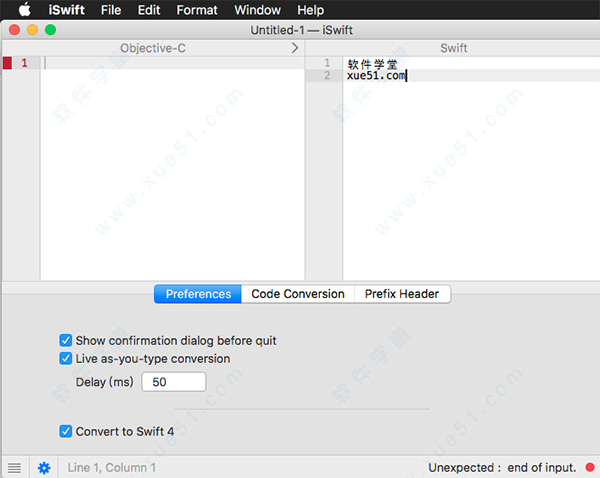 iswift mac是一款应用在mac平台上的Swift代码转换工具,它不仅能够帮助我们快速的将Objective-C代码转换成Swift代码,还支持代码的拖拽操作,从而更加高效的进行代码的转换操作,同时软件附加自定义的偏好面板,您可以根据自己的喜好来添加选项进行确认对话框的启用/禁用效果,在递增/递减运算符正确翻译的情况下完美的帮助您进行代码转换操作。