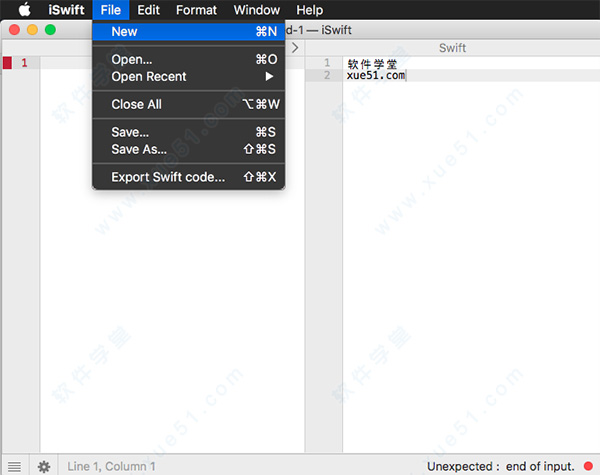 1、运行程序,首先我们在macos菜单栏中点击“File”文件按钮,在弹出的下拉框中选择“New”进行项目的新建操作