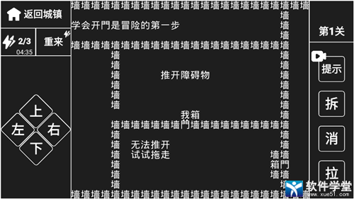 第三步:门前有箱子是无法推动的,可以通过拉来讲箱子移开,之后从门中过去,就可以顺利的过第一关了。
