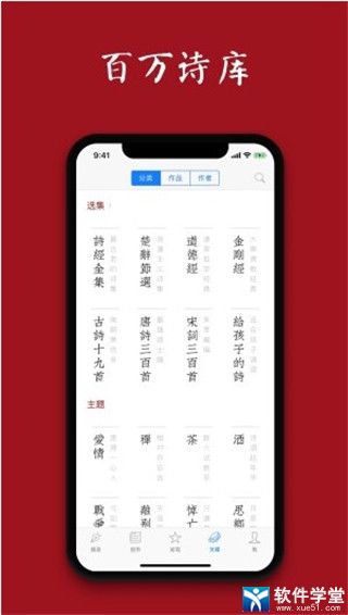 3、分类赏析:诗经、古诗十九首等选集,爱情、孤独、田园等主题,春夏秋冬、梅桃荷菊、山水日月等写景,中国传统节日与24节气。