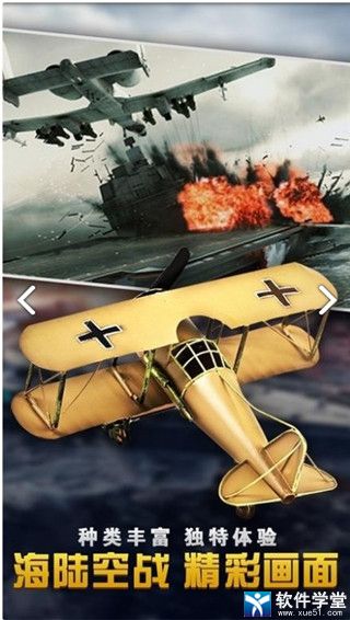 反击空袭正版是一款非常刺激的射击游戏,它以二战时期的空战为蓝本而制作,在游戏中,玩家将会化身为一名优秀的飞行员杰克,通过操控它来完成一系列系统任务,每个任务都有不同的需要达成的目标以及实力不同的敌人需要打败,在游戏中,玩家可以驾驶各种外观率骑兵、功能强大的战机进行战斗,只要玩家想得到的战机,游戏里都应有尽有,游戏画面采用3D技术打造,不管是各种战斗场景还是战机模型都打造得非常炫酷逼真,玩家在游戏里可以驾驶自己的伙伴疯狂扫射敌人,十分热血刺激,既然是以战争为背景,那就不可避免的会运用到各种军事策略和战术,这也是游戏的另一大亮点,在游戏过程中,玩家可以灵活运用自己已知的战略来驯熟打败敌人,收获战利品并取得相应奖励来解锁新的玩法或者购买和升级武器装备,玩法丰富。可玩性很强,如果你很喜欢射击类的游戏,那么小编就建议你来试一试这款游戏,还在等什么?快来开始一场酣畅淋漓的热血之战吧!