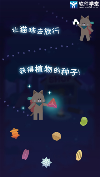 放置游戏,游戏主打休闲治愈的玩法,玩家基本上是无事可做,只需要为猫咪选择好出门冒险的道具,然后耐心的等待就好了,期间也可以退出游戏离线做其他事情,过一段时间后小猫就会带着植物种子回来,玩家可以选择一个小动物帮你来照顾种子,经过一段时间的照顾,种子就会生长发芽,开出漂亮的花。随着游戏时间的推进来帮忙的小动物会越来越多,玩家选择不同的小动物种出的植物也会各不相同,玩家可以收集各种各样的植物,并把它们加入图鉴中,努力收集全部的植物吧!游戏的画风非常唯美,游戏中夜晚的萤火虫一闪一闪的非常好看,还有超多可爱Q萌都小动物,配上简单的音乐,和登录游戏后各种不同的植物惊喜,给玩家带来无尽的温馨和治愈。