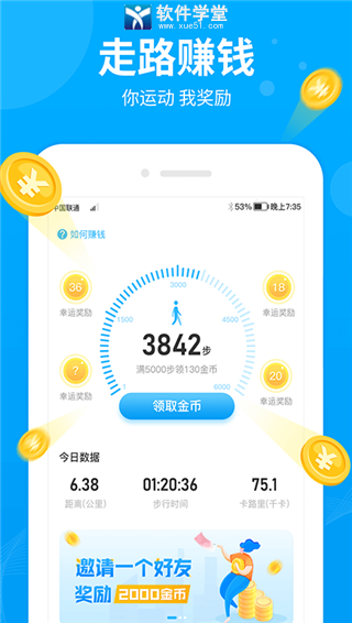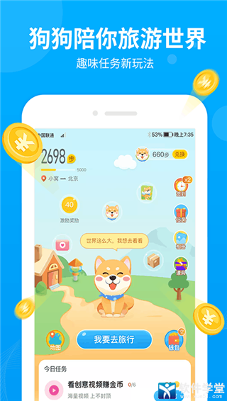 4、当你在现实生活中行走了一定步数后,进入app,趣走路中的“你”将同步前进步数上限,每次步将给予一定金币币奖励,兑换现金红包。