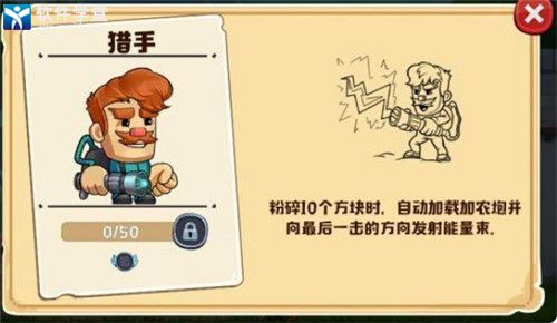 1、每击碎10个方块,则会向击碎的最后一块方块的方向发射一击激光能量束。能量束的威力可远远要高于兰多的箭哦。猎手的能量束可以击碎所触碰到的一切障碍、怪物(包括幽灵)、陷阱等。并且触发条件也更为简单,仅需击碎10个方块即可触发。需要50个猎手碎片即可获取该英雄。