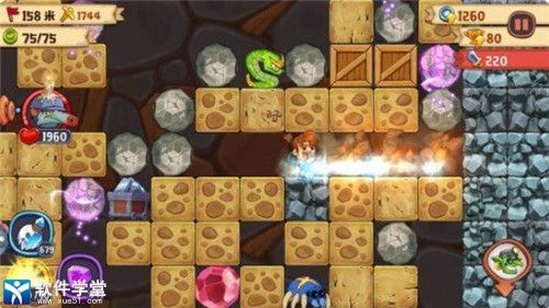 地牢之中,你的任务是不断向下挖掘宝物,获取各种不同的奖励,在这个过程中,你会遇到各种各样的怪物或者阻挡你前进的坚硬的岩石,不过你不用担心,你可以使用不同的英雄来帮助你,最后使用你收集到的宝石来作为你对抗国王的武器,此外游戏里还提供了大量帮助你进行挖掘的道具,你可以使用药剂让大地冰封,也可以使用炼金术点石成金,非常的强力有效,喜欢这款游戏的朋友不妨来本站下载试玩一下。