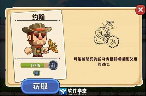 技能:每条被杀死的蛇,可以恢复鹤嘴锄耐久度25%