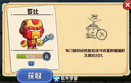 酷儿的学识有限,暂时没有看出来罗比到底是哪部游戏或者电影里面的人物。希望多才多艺的你们不吝指点哦!(难道是钢铁侠???难道不是Tony嘛)罗比的技能也是非常好使用,只要杀死经常出现的加农炮(实际上长得更像电磁炮)就可以恢复鹤嘴锄耐久值啦