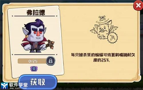 技能:每只被杀死的蝙蝠可以恢复鹤嘴锄25%的耐久度