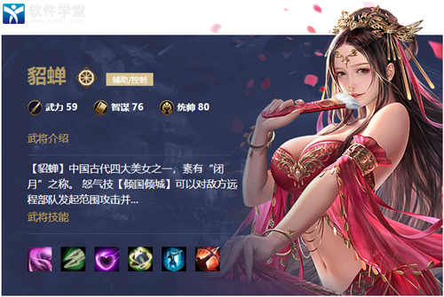 2、【貂蝉】中国古代四大美女之一,素有“闭月”之称。 怒气技“倾国倾城”可以对敌方远程部队发起范围攻击并造成晕眩,触发技可以虚弱敌方远程部队;