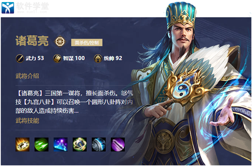 3、【诸葛亮】三国第一谋将,擅长面杀伤。怒气技【九宫八卦】可以召唤一个圆形八卦阵对内部的敌人造成持续伤害与减速。观星,可以让所有武将的怒气槽提升;