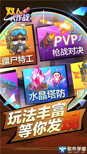 双人大作战官方版是一款双人射击作战游戏,该游戏提供丰富的枪支和海量的道具,玩家可以参与到各种pk挑战中,玩法非常丰富。在游戏中查看各种玩法场景设定的信息,自由点击就自动匹配对手,开启挑战。使用各种激战武器,将对方打败,赢得游戏胜利。游戏最好玩的就是可以进行双人同屏操作,你可以选择和自己的恋人或者朋友 同一起同屏战斗。其中僵尸特工有点像无尽关卡挑战,随着关卡层数的递进,僵尸数量和种类也在增加,你要做的就是和队友一起歼灭全部僵尸,如果过程中有一方阵亡,那么你可以前往对方倒下的位置进行施救,循环往复,只要保证一人存活,相当于无限生命。感兴趣的朋友快来下载体验吧!