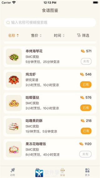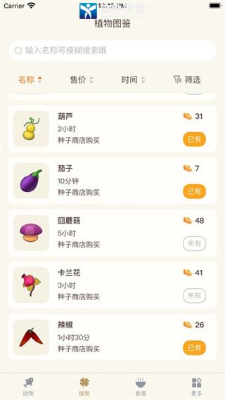3、提供最新的图鉴内容,都是会根据动物、植物、食谱、家具等不同的元素分类的。