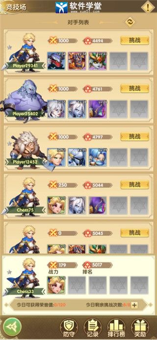 排行榜:竞技场排行榜可以查看玩家的名次情况,并可查看防守阵容和上阵英雄信息。