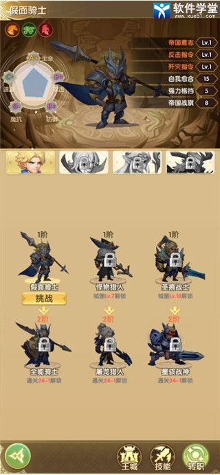 一阶转职:通关关卡1-3、王城等级lv7、王城等级lv10。