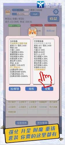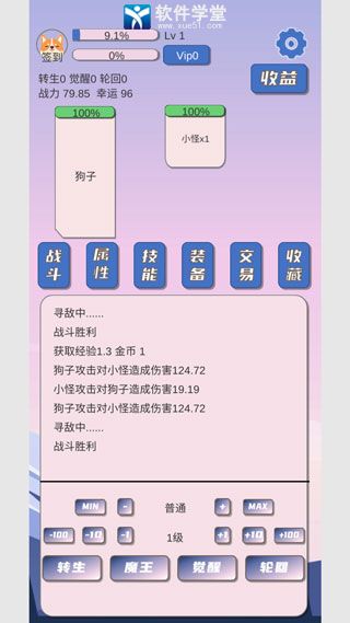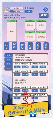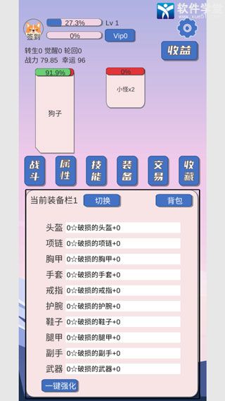 狗子放置官方版是一款十分有趣的放置类的文字挂机手游,游戏的界面也是超级治愈的,玩腻了动作类的朋友可以来体验一番,这一定可以带给你一场新奇的体验。在这里你可以自由选择怪物的等级、数量、难度,让你挂机的时候可以拥有最高的挂机效率。超高攻速,一秒五刀,刀刀暴击秒杀小怪。而且最有趣的是在这款游戏中得到强化的不是装备,而是装备栏,所以你更换了装备之后也是不会掉等级的,各种资源都不会有一点浪费。而且游戏不需要充值,所以商店所有物品都可以购买,而且只要你挂机,总有你需要的东西,就连vip等级也只需要挂机就可以提升哦!总之来说,这款游戏只要挂机就可以畅玩一切,你就是这个世界的神哦!感兴趣的玩家就快来下载吧!