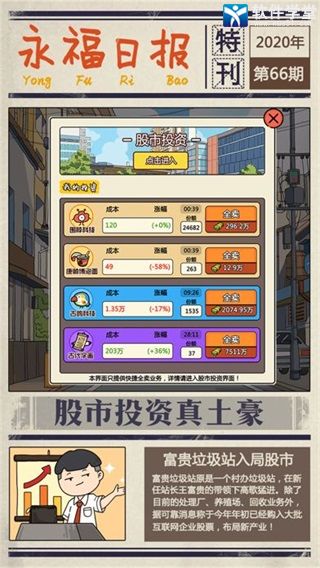 再升级就会开启第三个核心玩法就是股票,股市每3分钟刷新一次行情,玩家需要做的就是低价大量买进,然后等股票涨了再卖掉!注意不要买“濒临破产”的股票,会血本无归。