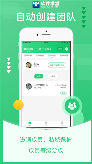 2、注册就自动创建团队,邀请成员加入你的团队;不再担心建群被别人把代理粉加走,从此保护你的私域用户。