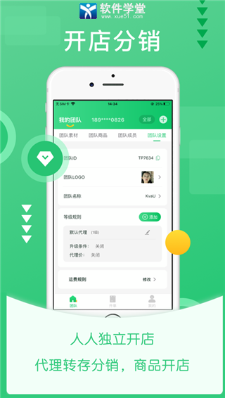 微信卖货等社交场景的素材共享、小程序微店开店、团队管理、分销管理等营销。链接一个人就是链接一个团队,自己的团队发展代理成员,代理成员再拥有他们自己的团队,他们再发展他们自己的成员,让你的生意不快速不断放大规模。