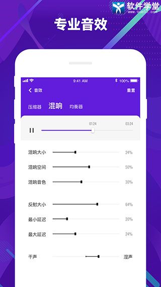 支持录音棚、ktv、巨星、动听、房间、自然、留声机等音效也支持自定义音效,iOS还支持耳返。