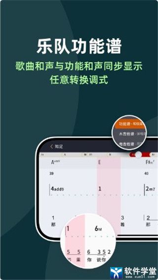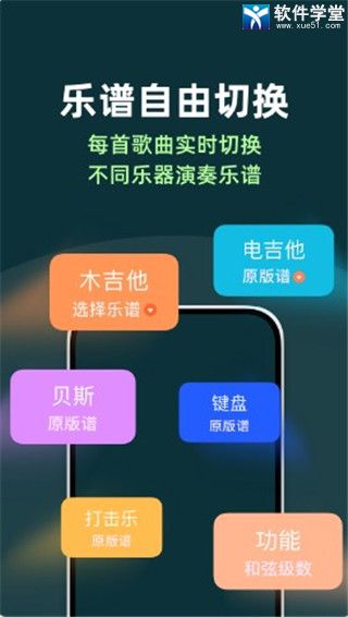 2、支持吉他、鼓、键盘和钢琴四种主流乐器的线性乐谱显示。