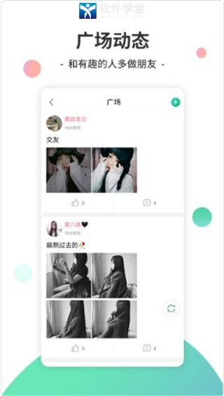 1、交友广场,发布你当下的心情感受,打造你个人的个性空间,寻找一见如故、心心相印的朋友。