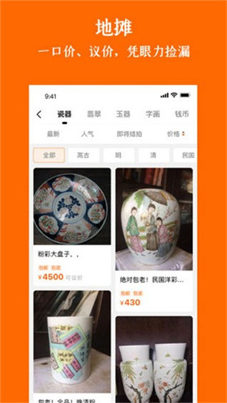1、地摊捡漏:海量藏品每天更新上万件,人人都想捡到漏,玉器、瓷器、珠宝等各类古玩藏品任你挑。