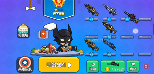 另外,在游戏中还拥有着许许多多的武器、装备、人物提供给玩家任意使用,例如狙击枪、冲锋枪、手枪、反弹枪等武器,还有着彼得潘、杀手里昂、蝙蝠侠等多种人物角色任意选择。感兴趣的朋友欢迎来下载体验!