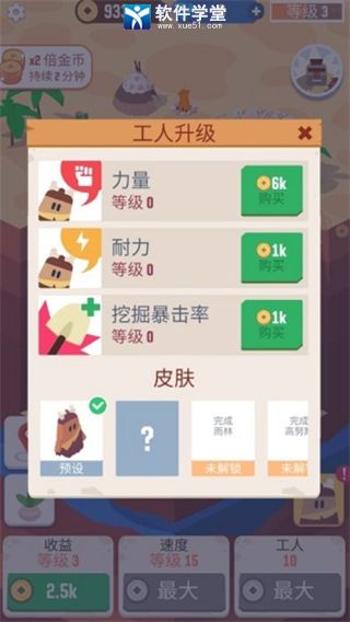 不仅如此,玩家还能针对工人的能力进行升级,力量、耐力和挖掘时的暴击率,都能增加挖掘采矿的效率,如图: