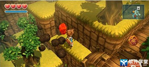 3、过之后继续往前,会走到一个洞穴门口,但是有障碍物挡着,进不去。这时候先从左边的楼梯上去,然后把箱子推下来,直走就能找到一个机关开关,打开机关就可进入洞穴。