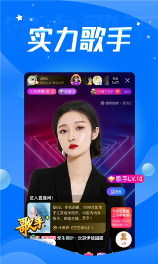 用音乐展示自己,用歌声与观众互动。这里是唱歌最好听的直播平台,汇集各类型歌手,拥有海量原版伴奏,还有演唱会、录音棚、KTV等不同音效,秒开的视频直播体验,带给观众全新的音乐互动盛宴。
